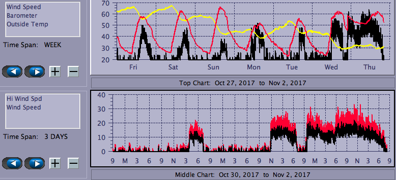 Unusual wind even at DC; wind started up at noon Wednesday, blew till 7, then picked up at 9 PM and blew all night and all day until about 7:30 PM. Gusts into the low 30s around noon. Gusts and holes. The kiters appeared to be handling it better than I did.