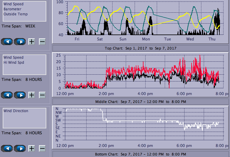Smoky and windless until about 2 when a light breeze suddenly appeared from the SW. Tiny "mightcaps" when I arrived at CB, but since I hadn't sailed yet this month and wanted to try out my new wetsuit (thanks Josh, it worked great!) I went ahead and rigged my biggest sail. And it payed off:-) By the time I got on the water there was enough wind to plane (and lots of kites in the air up at BWB). Getting weedier by the day as the water level drops, but still sailable as long as you have a weed fin installed. My sources (John D, actually) tell me that Josh was sailing somewhere on DC, possible IB?