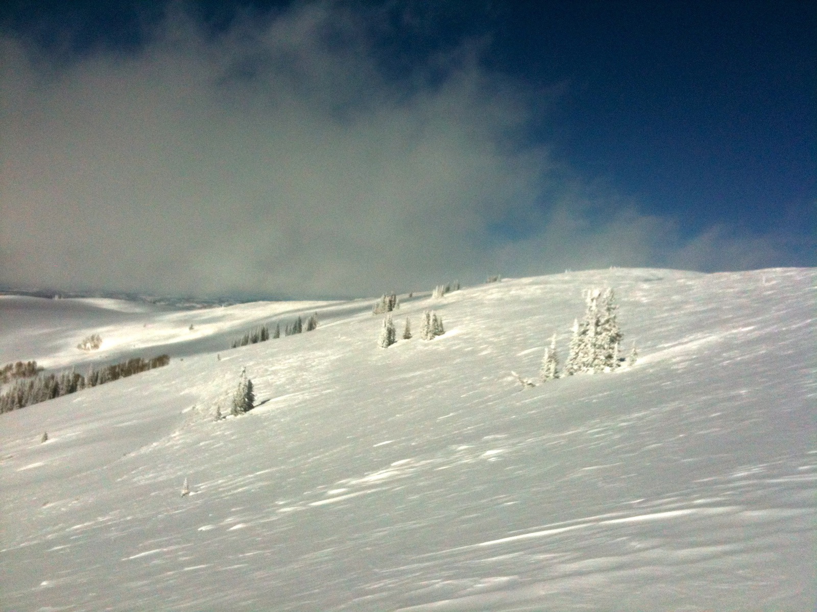 It snowed at least 2 feet at Skyline with the last storm. Most of the new snow settled out over Friday night and made for good fast and soft powder conditions on Saturday. Grey skies until the sun finally made appearance in the afternoon and a half dozen of us shredded powered under our big kites. Best wind was in the mid-afternoon. Fun day on the Skyline. Here is a shot out on the west ridge with my phone.