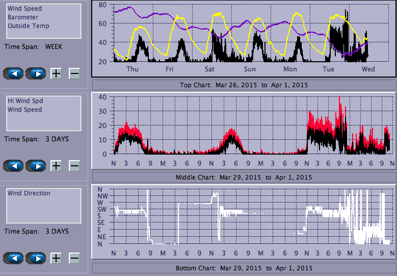 It appears as though for once conditions at DC rivaled those at Grants. The wind arrived abruptly at noon and rapidly reached a peak of 30, then very slowly backed off and became increasingly gusty. Enough in the gusts that I was fully powered up on a 5.0, a rarity at DC. The kites upwind at BWB looked like a flock of swallows, swooping and soaring in the gusts.
