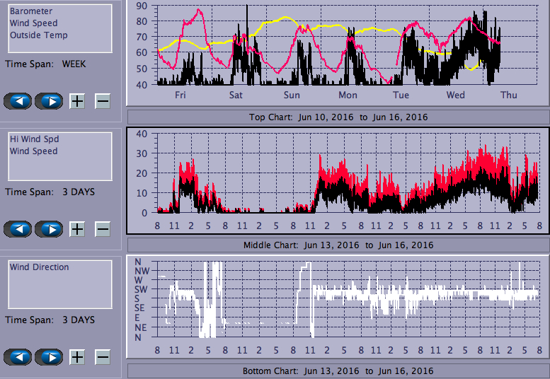 Usually "the early bird gets the worm" at DC, i.e. the wind is strongest and steadiest shortly after it comes up. Not yesterday! It just kept increasing, and while never exactly steady, it did seem to get a bit steadiER as the afternoon and evening progressed. It didn't hit its peak until 9 PM, backed off until 3 AM, and then started building again. Gusting into the low 20's right now.