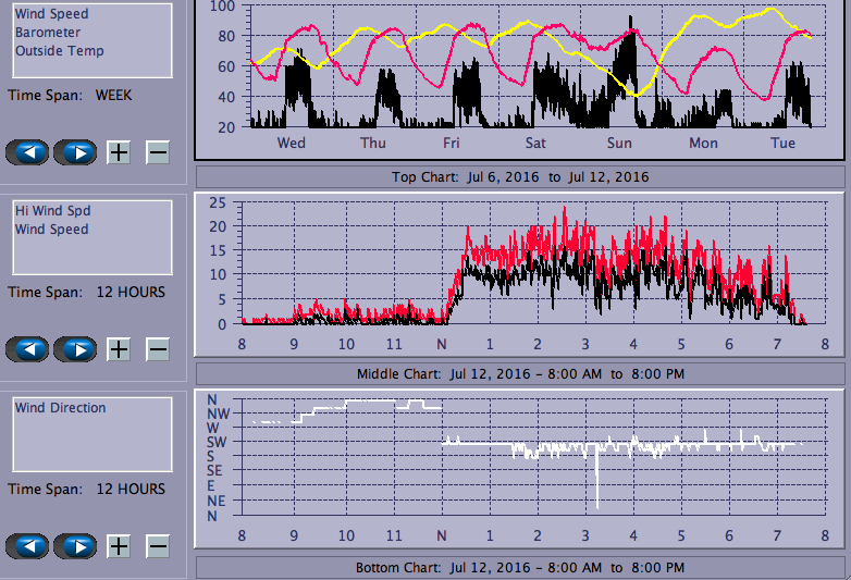 For once the NWS got it just about right: "Southwest wind 6 to 11 increasing to 12 to 17 mph in the afternoon." Nothing like Sunday's nuker, but enough for some nice rides. Initially pretty steady but, as usual, got progressively gustier as the afternoon wore on. The water level continues its inexorable decline but Chucktown is still sailable, just a bit weedy on the near side.