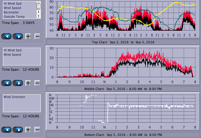 DC served up one of the nicest days in recent memory; blue sky, early fall colors, strong, steady wind, relatively few boats, smooth swells. What's not to like (unless you were one of the two small boat sailors stranded at BWB due to too much wind)? One look at the traffic crawling down 189 made BWB seen like the best option for my launch site despite the LONG walk to the water. One other windsurfer and numerous kiteboarders, including (in no particular order) Mike Hill, Jim Hornbeck, Peter Miller and John Guay.