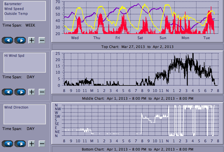 Actually, DC would have yielded up a pretty good session Tuesday - if I'd gotten there a little earlier. The sky was clear, the air temp was in the low 50s, and the wind was fairly strong (gusting to 25) and remarkably steady considering that it was out of the NW. Because it was a little chilly and the wind appeared to be building, I rigged small - 5.0. Mistake! Got a couple of planing rides on the way out, but, as it turned out, the wind had peaked and was rapidly fading. Re-rigged my 7m and got a couple more rides. Snooze you loose!!