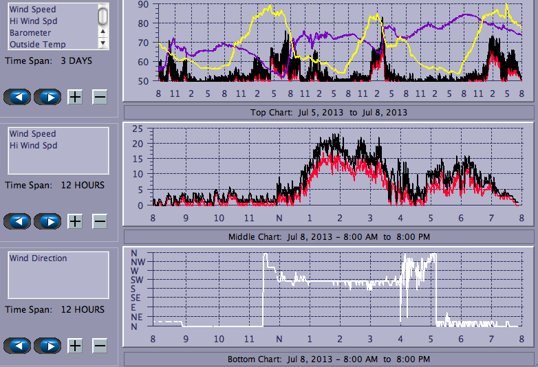 Snooze, you loose! When I arrived at IB about 1:30, things looked pretty good - small whitecaps everywhere and very few holes. A smallish board seemed like the call. Alas, by time I got on the water (1:52) there were holes galore. Decent gusts continued to roll through, but less and less frequently, the lulls got more and more profound (as in flat, dead calm) and the wind direction became less and less stable; the wind looks a lot better on the chart than it actually was. Still, it was fun to finally get back on the water!