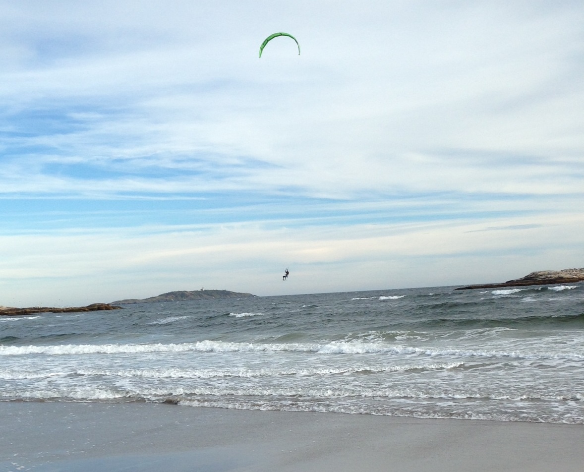 I'm in Maine for a wedding and some sightseeing. Wind was upper teens. A 12-13m would have been the right kite, but I have a 10m and 16m with me. Small, 2-3 ft waves, a little on the cool side in the northern Atlantic, air was low 60s and I'd guess the water was about the same. Big beach with some cool rock islands just offshore.
