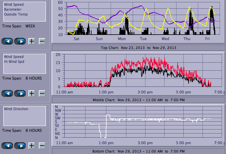 Black Friday surprise! As late as 12:55 the National Weather Service was calling for "Mostly sunny, with a high near 48. Calm wind." They got the sunny part right and were pretty close on the temperature, but shortly after 1 PM the leaves began to rustle, and by 1:15 things started to look promising. I got on the water about 2:30 and immediately regretted not rigging bigger, but by 3 the wind had filled in enough to allow pretty consistent planing with a 7.5. The water level is gradually rising, and the water temp is, of course, falling - I got a reading of 42F with an IR thermometer, but I'm a bit skeptical of that figure. In any event, my dry suit and neoprene mittens provided more than adequate warmth.