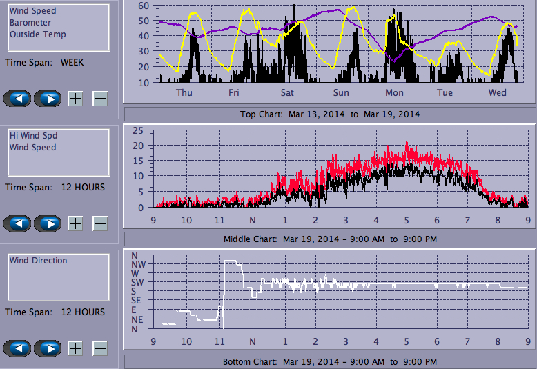 SW wind showed up at noon but took a long time to get serious. Didn't peak until 5. Pretty gusty, but I did get some rides with my 7M and big board. Water level continues to rise slowly, and water temp remains cold!