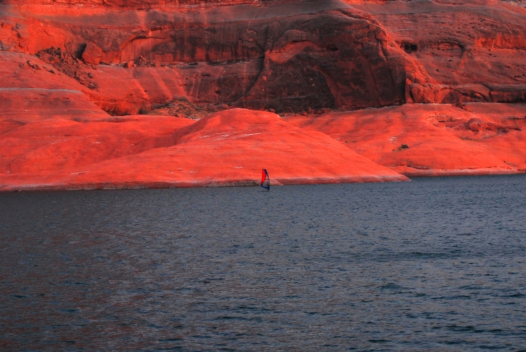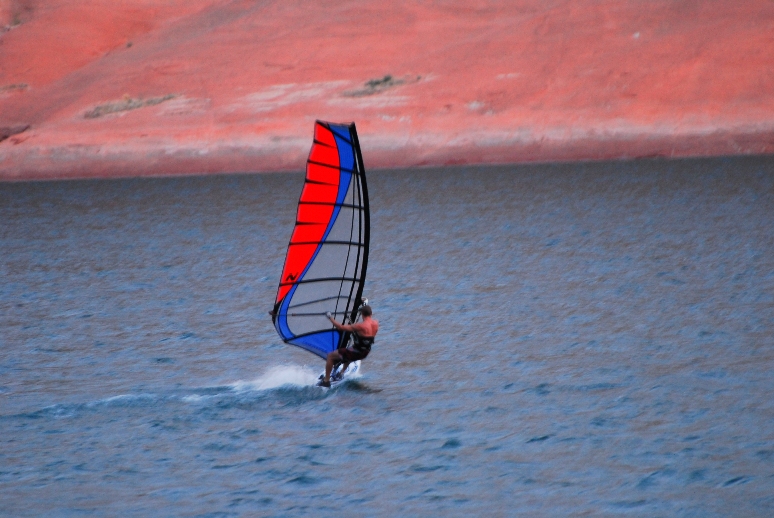 If Rush were full it'd be easy. Actually, it would be a different thing all together. For me, half of the fun is doing it on Utah lake. When Utah Lake is on, really there's no better place to sail around here. ooh, actually, I'm having all kinds of arguments come up in my mind to that... My best session of my entire life, possibly anywhere, was Lake Powell. (Actually at 9 years of age at lake powell is where I had my first windsurf experience). But I think it was July 2005, boardshorts, 100 degree air, 80 degree water, 32-35mph wind for 5 hours and HUGE swell up in Bullfrog... Spirit altering Red rock, sweet beaches, and clean sandstone rigging areas... Houseboat, so much to do, hiking, last year we made scuba a part of it on 300 foot walls into the abyss, it goes on and on... But that's a can o' worms, good worms... Cuz yes it's far to the south and all frontal. Actually, down in Wahweap canyons past Antelope point up the canyon we parked the houseboat in a place where an evening thermal came through and I sailed fan-like 6.7... Now I'm dreaming... And have started a conversation with myself here! That's what this sport does to me!