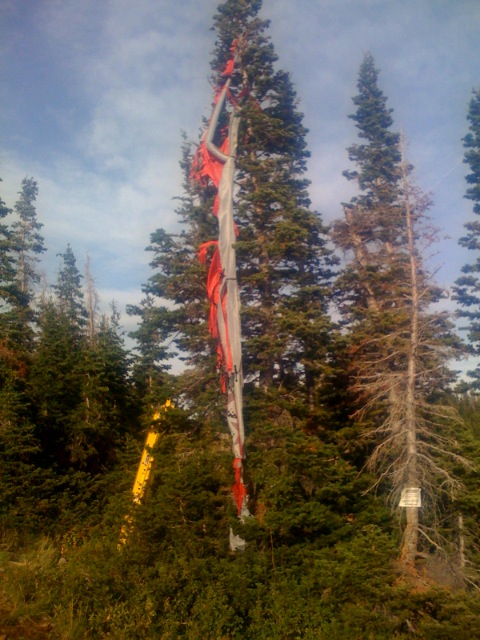 Todd, I don't know who's kite it was. Early last winter, just heard a guy crashed his kite on the way from the parking lot to the riding area. Its tricky there, so maybe he had some troubles getting through and caught the tree. I heard from someone that he watched them try and retrieve the kite, then abandon it. Looked like it was a nice new kite.