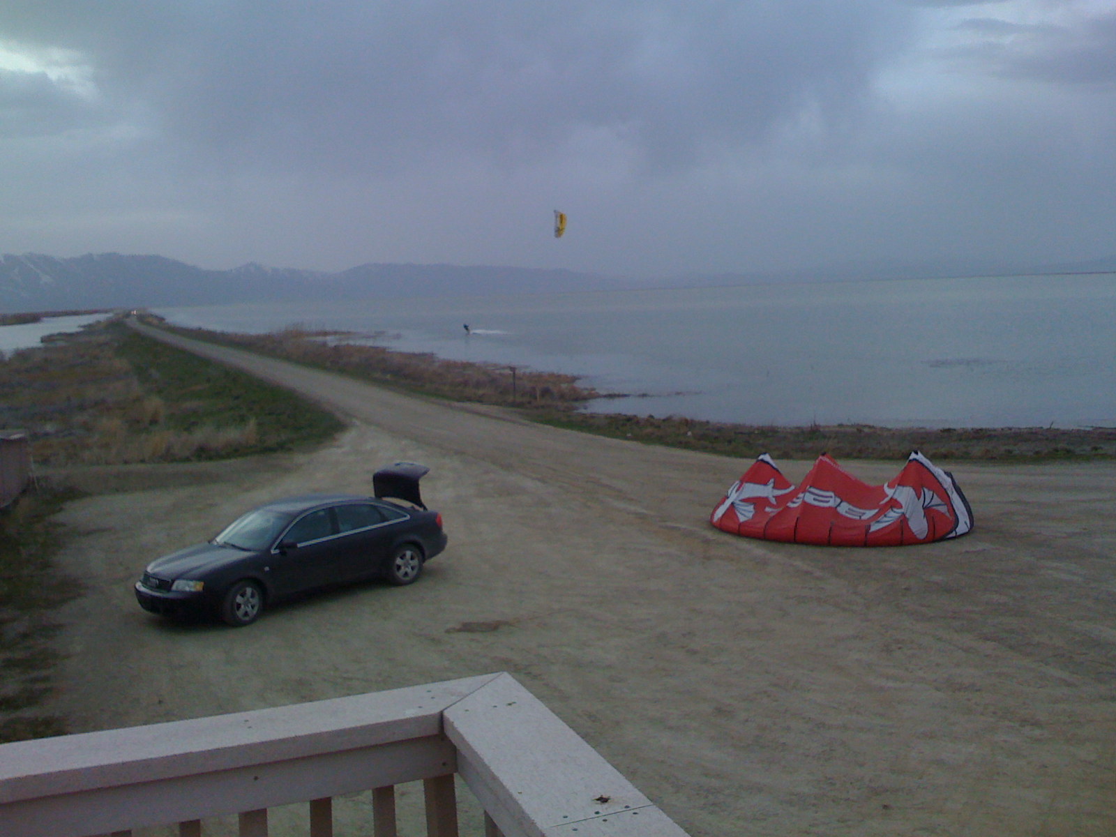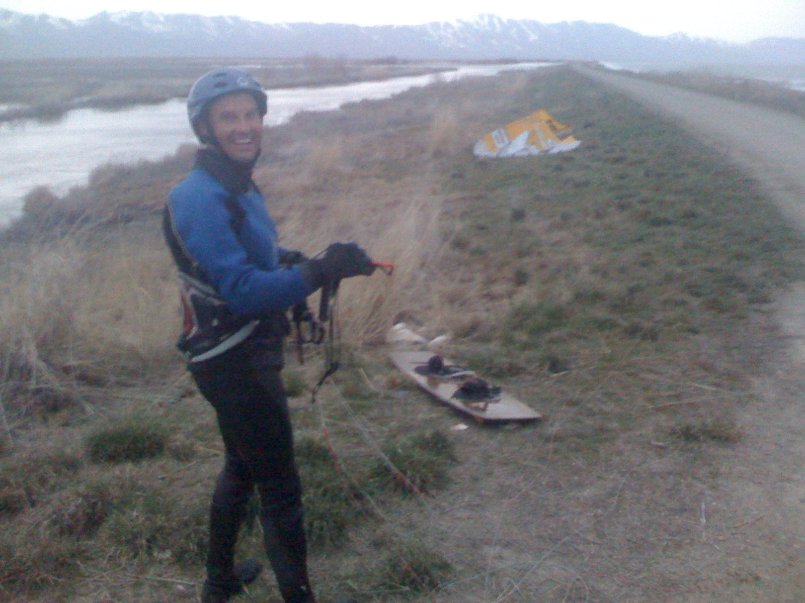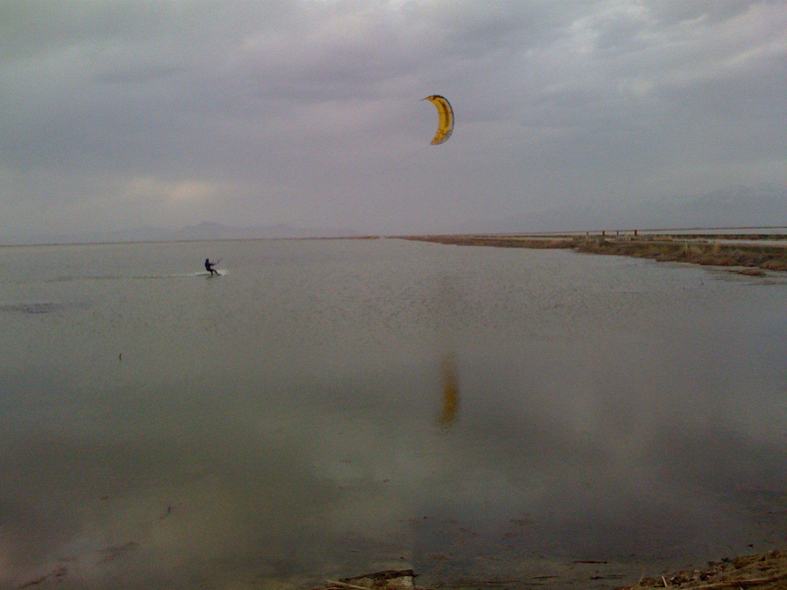 Kited till dark, about 8. Pretty good time. Kind of like a big rush lake. the water was knee to waste deep everywhere we kited with mud on the bottom similar to rush. One road was almost perpendicular to the wind direction (south) and the other road was about parallel which made it easy to walk back up wind when the wind was light.