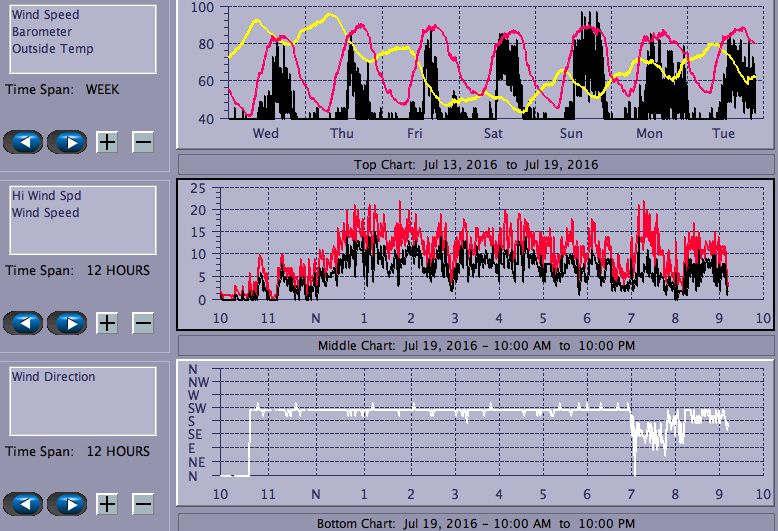 Quite windy on DC considering how hot it's been. The wind was not so much gusty as intermittent, with intervals of fairly strong wind interspersed between longer periods of light breeze. A pleasant afternoon, shared by Judy (5.5), John D.(7.5) and surprisingly few kiters.