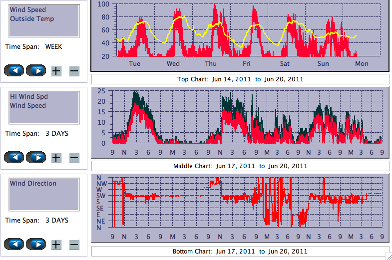 Top Chart: temp in ºF---Middle Chart: Wind Speed is 1 min. average, Hi Wind Spd is peak gust in 1 min interval - both in knots