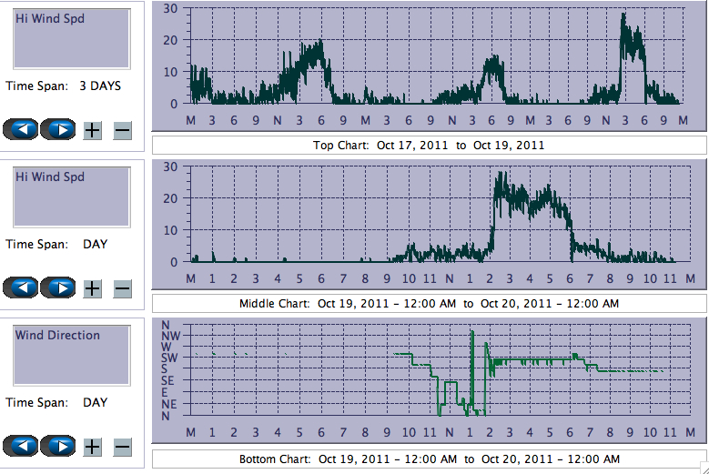 Beautiful, crisp fall day. Just as Craig predicted, the SW wind kicked in right at 2, ramped up quickly into the mid 20s (peak gust 28) and stopped abruptly at 6. Air temp topped out at 67, so gloves were not needed, but a series of nights in the 30s has taken a toll on the water temp. Very powered up on my 6.0 and very happy to be back on the water. Numerous kites in the air at BWB.