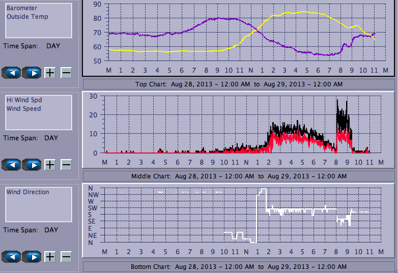 Thunderstorms have finally cleared. DC was smooth from 2:30-5:00 under blue skies. I was fully powered on 17m and Mike was on 12m. Rode twin tip and surfboard but could have been on twin tip the entire time. Saw Jim cruisin nicely upwind. Getting excited for a windy fall.