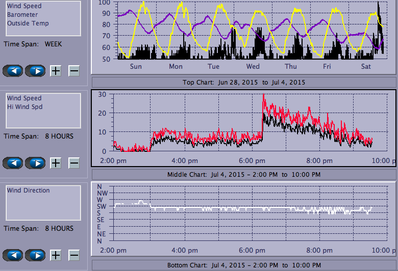 Another hot, windless day until about 6:15. Starting to look thundery, probably just a random poltergust. But I am seeing a lot readings in the high teens/low twenties. Better have a look. Breezy, but not a lot of whitecaps. On the plus side, surprisingly (to me, at least) little boat motorboat traffic. Not sure what to expect. Went out with my 7.0 rigged full and was immediately very powered up. Got in a nice 45 minute session as the wind gradually backed off. A very nice Independence Day surprise!