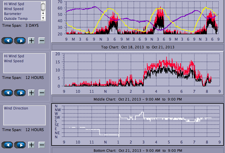 Continuing the pattern of the past few days, the wind peaked quite late (about 4:45 today). Not as strong as yesterday, but a bit steadier. Water temp measured 57ºF.