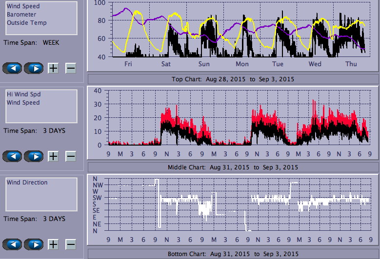 Strange day windwise: Yesterday's wind finally petered out completely at about 9 PM only to start back up at midnight and blow all night. Extremely gusty until about 11:30 when it steadied out enough to make for some very enjoyable sailing.