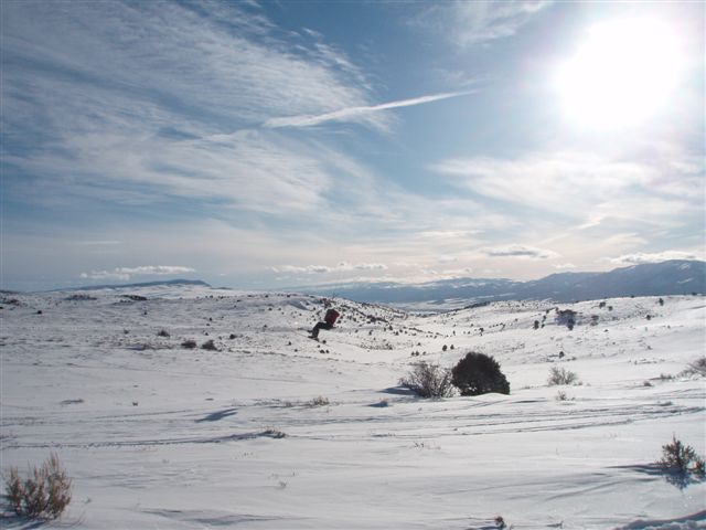 So off the backway we went, doubling back on I-70 and heading south on the next highway westward... toward Fish lake. There is a ridge at the entrance to Fish Lake that sits around 9,000 feet. The problem was the recent snow (which hasn't appeared there until now) had been blown off and the good terrain was rock strewn and wind scoured. We dropped back down the road a few miles to an area with rolling hills and some protected powder stashes. Not a big area, maybe medium to small, but plenty long of a ridge for fun exploring in and out of bowls. And clouds were blowing back revealing the first blue skies of the day.