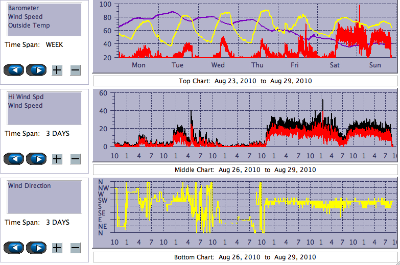 "Ragged" Wind Direction plot and broad Wind Speed band indicate gusty conditions.