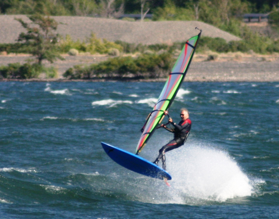 The day Fred (The Shred) returned to the Gorge with a pristine Bailey 8’6” and just gave it to me. There I was shooting video at The Wall and up walks Fred. Within a few moments he has pulled out his very slightly used Bailey, which he says he’ll never sail again, and he won’t take any money for it, it’s just mine! Moments later with a skeg hastily slapped in, the Bailey and I launch into sweet 3.7 Wall conditions. And, we just rocked for hours, culminating in a fetch up to Rufus, where Vern Stokes pretty much saved my thirsty life with a cold beer. I found Marty, John, and Brian a little farther up the beach just chill’n, and commenced to chill right along. As I got up to return to my launch, there was some comment about it being a little too windy to be really fun Kiting. I fetched back to The Wall, and put out just in time to see a smiling, laughing, Marty coming up into the swells just off The Wall launch. I guess maybe it wasn’t too windy after all, since he proceeded to shred swells like a Cuisinart on Coke, while I shot video (look for it at the season opener next year). When he finally did crash, or maybe he was just laying in the water to rest, he yelled through an ear to ear grin “is this fun or what!” Pretty much summed up my day as well.