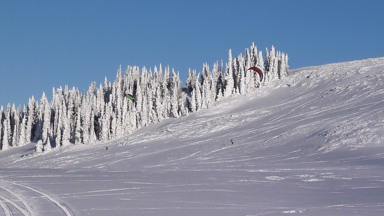 Clouds began to clear at some point mid day and the wind picked up. Truly surreal with clouds wisping around and visibility coming in and out. Once it started it just got better, and turned into a bluebird smooth and strong sunset session. Huge crew of riders from all over, 7 or so from Colorado caravan-ed out together. A new Snowkiter from Washington DC earned his winter wings, and Jeff Kafka from San Fransisco dropped in with kiters from Mexico and a pro-rider from Team Norway. Along with a few Utah locals, the skies filled with kites in every direction, with people scoring their own fresh powder tracks from the new 8 inches that dropped last night.