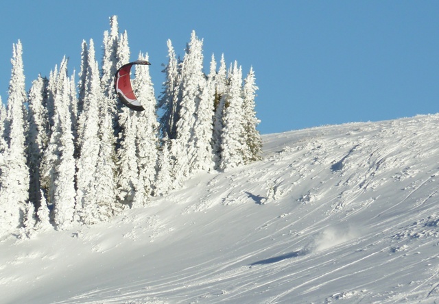 Most riders were too tired to exploit the evening session, as the 3 day hammer had taken its toll. Friday was 9 meter turning into lit 7 meter winds on alpine wind blown packed snow. Saturday brought another round with larger size kites. And today was powered up on 11-13 meter kites, powered enough to jump easily between 11-1 and to crank way up wind while carving like a kiddie. Ah, it was a good one folks, I'm very satisfied.