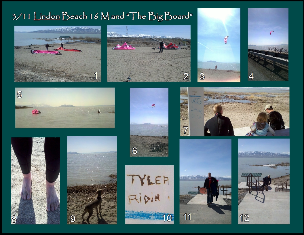 I got a call from Chris and Tyler saying the wind was blowing at Lindon and that I should meet them there with our wetsuits and the big board. I packed things up and in less than 15 minutes walked down the stairs to find them pumping up the 16's (see picture #1). Once the lines were walked (#2) and their wetsuits on, they were ready to launch.