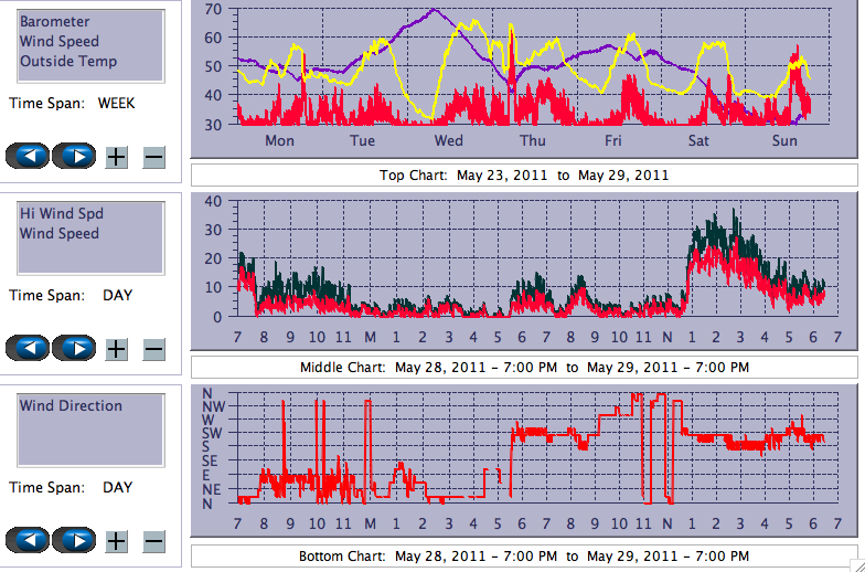 - In top panel, yellow=tempF, purple=barometric pressure, red=wind speed (1 min average)