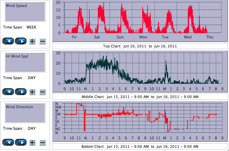 "Wind Speed" (top chart) is one minute average. "Hi Wind Spd" is peak gust in each one minute interval. All wind speeds in knots.
