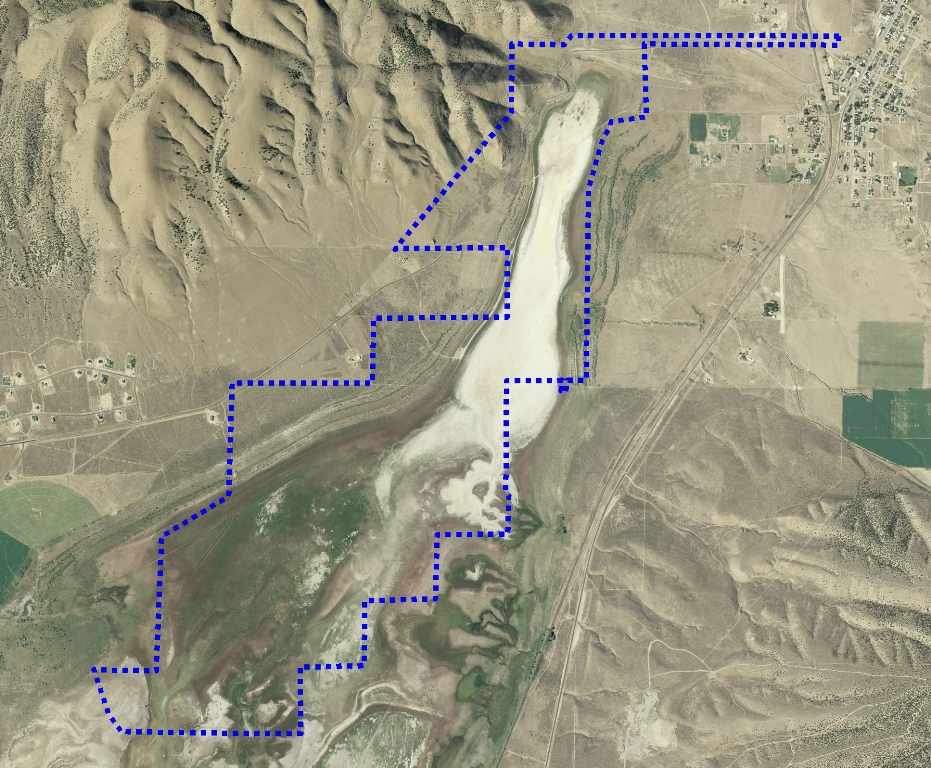 Here is an aerial of Rush with the BLM property boundary. Everything inside the blue dashed polygon is owned by the BLM. I have not seen the fence yet, could anyone locate it on this photo?. IF you know where it is and can draw the location in Google Earth then send me the line you drew (.kmz file) I will email a map to the BLM and ask them what they think. You could also send me GPS coordinates if you have them. bridoubek@yahoo.com